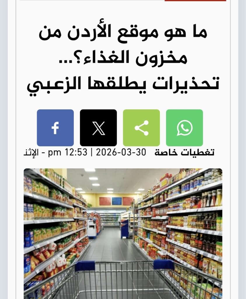 He emphasized that possible solutions lie in strengthening strategic reserves, diversifying supply sources, expanding international cooperation, and improving storage capacities. Countries like Jordan, he noted, possess relatively strong food reserves—especially wheat—covering four to six months, in line with global standards, while other states face greater challenges. ELZUBI highlighted that Egypt, as the world’s largest wheat importer, may face significant pressures, particularly with rising fertilizer and energy costs, which could affect its food subsidy programs. He concluded that the most critical problem is the absence of a strategic reserve of fertilizers, which makes confronting the crisis more complex and places global food security under a severe test in the coming period.